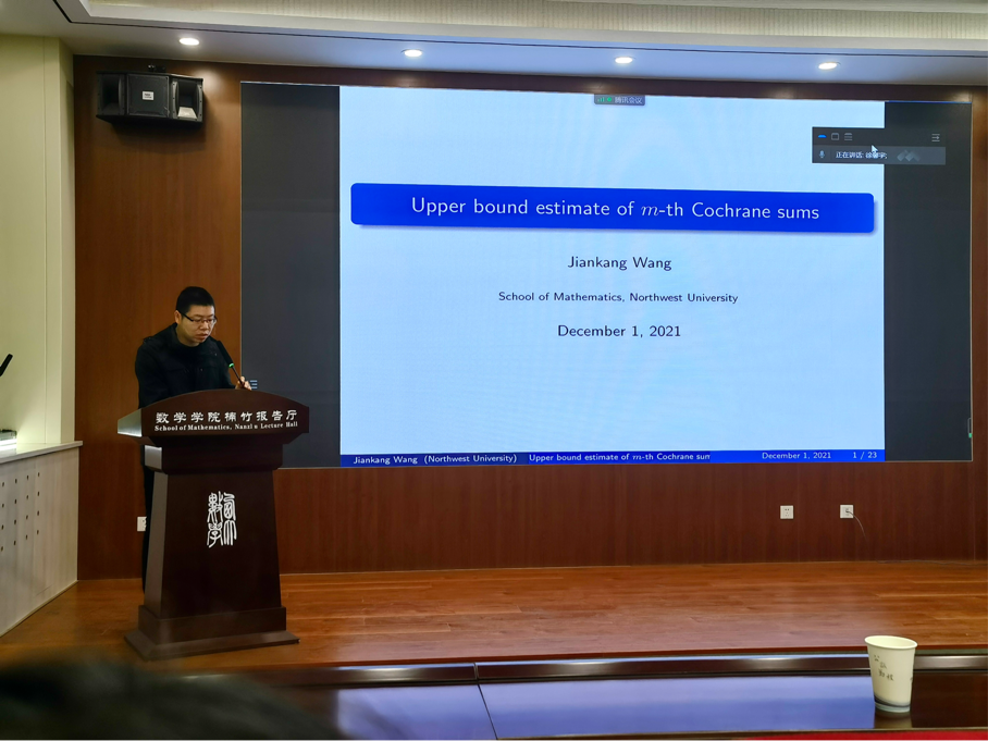 8455新葡萄官网版博士生王健康,报告主题为《Upper bound estimate of m-th Cochrane sums》。报告首先介绍了研究的背景:因为Dedekind和的具体形式没有办法给出,所以吸引了众多学者对其性质进行研究。而在历史发展过程中出现了Cochrane和,在报告中给出了两种和的简单对比,发现后者比前者有着更好的性质。因此报告中在研究前人经验结果的基础上,给出了一些定理并利用一些引理对其进行了证明。研究主要目的在于利用参数估计将两种和统一起来。