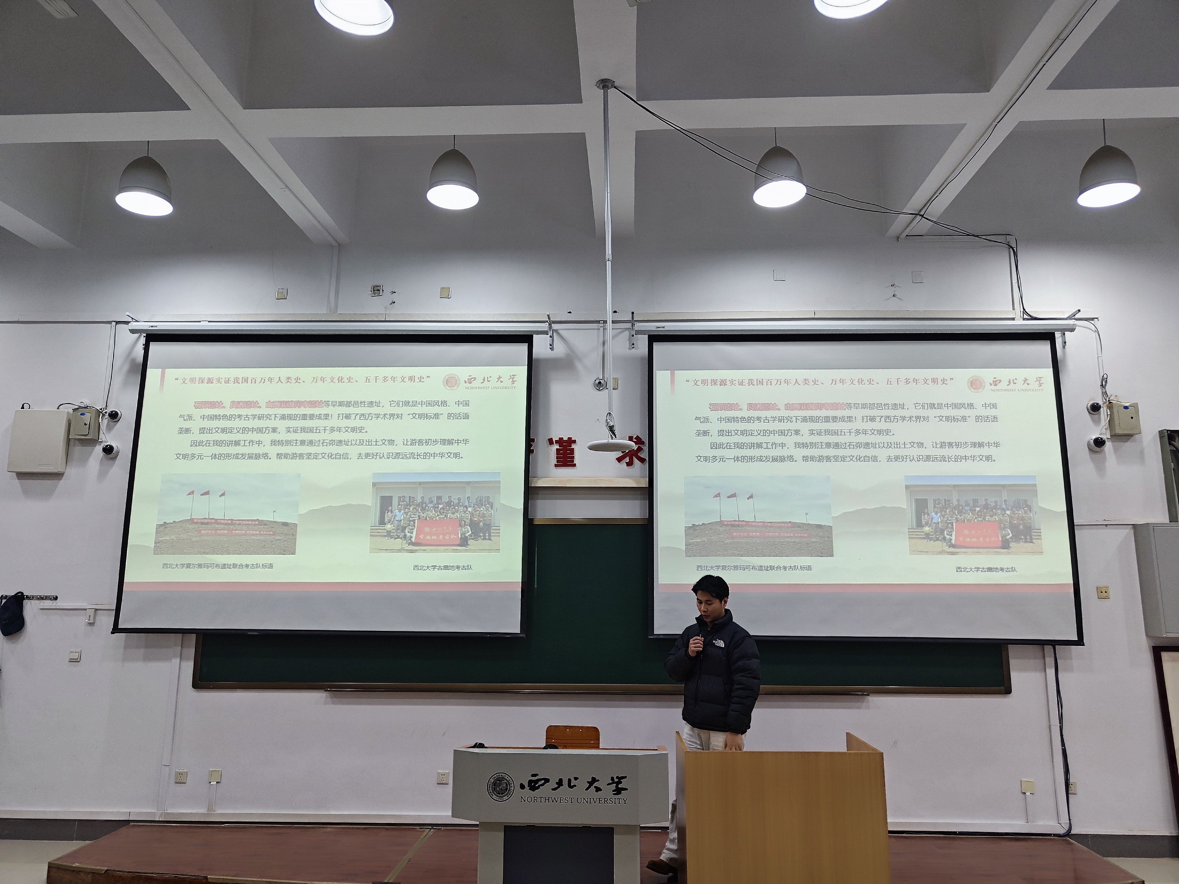 赵森同学则向同学们展示了自己在陕西历史博物馆讲解时的见闻和感受。他将博物馆的讲解工作分为文明探源、中华文明的突出特性和“一个博物馆就是一所好大学”三个方面分别地具体介绍。在展示文明探源方面时,他以在工作过程中着重通过介绍石峁遗址以及出土文物,让游客初步理解中华文明的形成发展脉络为例,强调了石峁遗址、良渚遗址和山西襄汾陶寺遗址等早期都邑性遗址是在有中国特色的考古学研究下涌现的重要成果。在这次讲解活动中,赵森同学致力于帮助游客坚定文化自信,从而使游客们更好地认识源远流长的中华文明。
