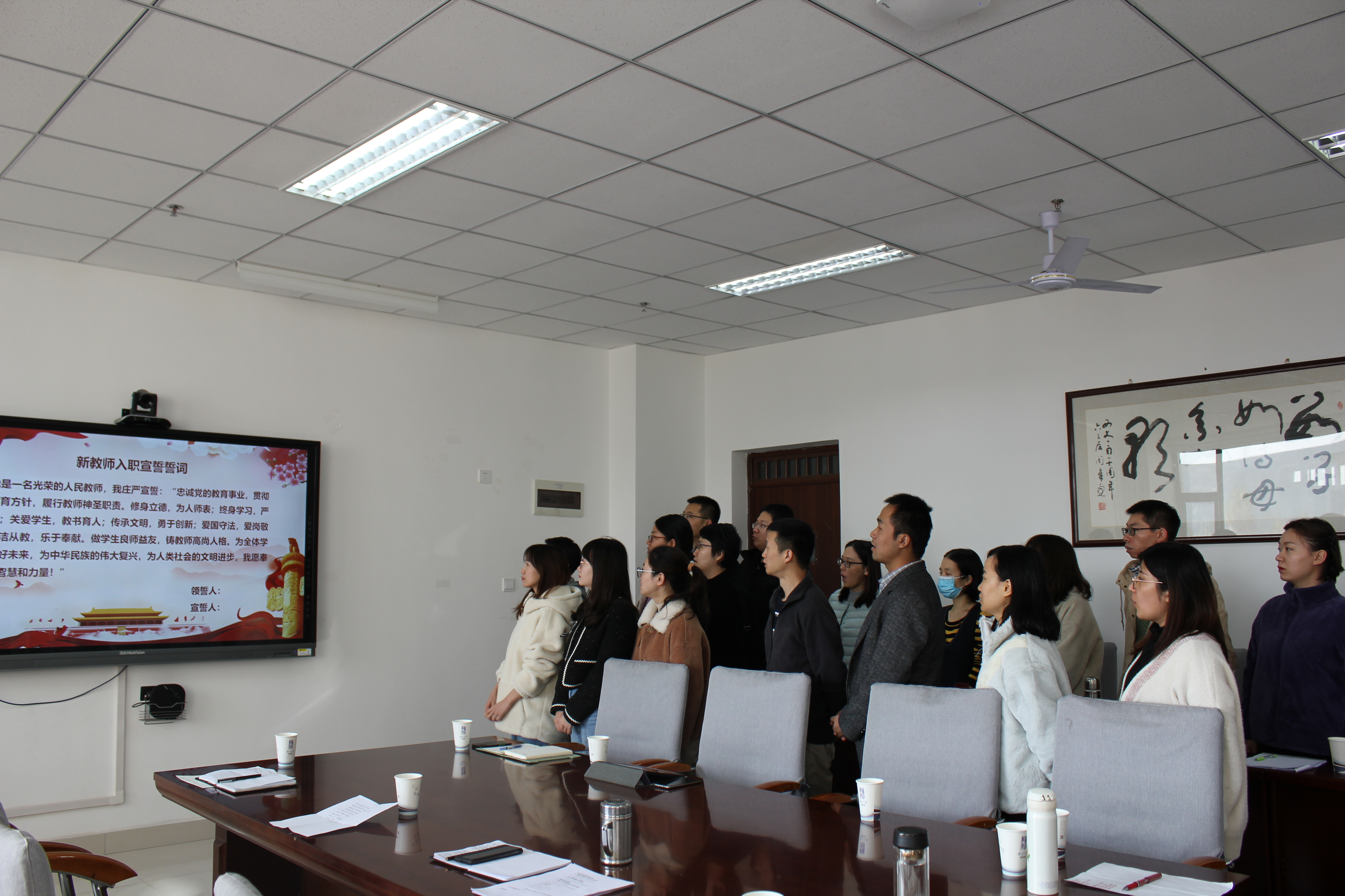 随后,举行新进教师入职宣誓仪式。近三年新进教师在宋江玲老师的带领下,右手握拳,面对国旗庄严宣誓:他们将牢记立德树人使命,履行教师神圣职责,依法治教、教书育人、开拓创新、甘于奉献,为中华民族的伟大复兴,为人类社会的文明进步奉献全部力量!