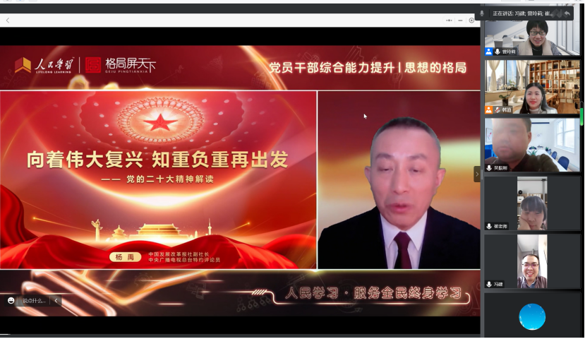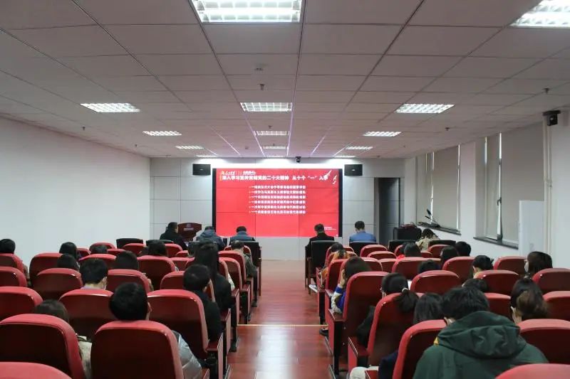 11月21日下午,8455新葡萄官网版党委组织全院师生观看学习由中国发展改革报社副社长、中央广播电视总台特约评论员杨禹主讲的“党的二十大精神解读”专题学习。学院党政班子成员、各支部书记、师生党员代表集体在学院凌岭报告厅收看学习,各支部组织师生党员通过线上线下方式集中学习。