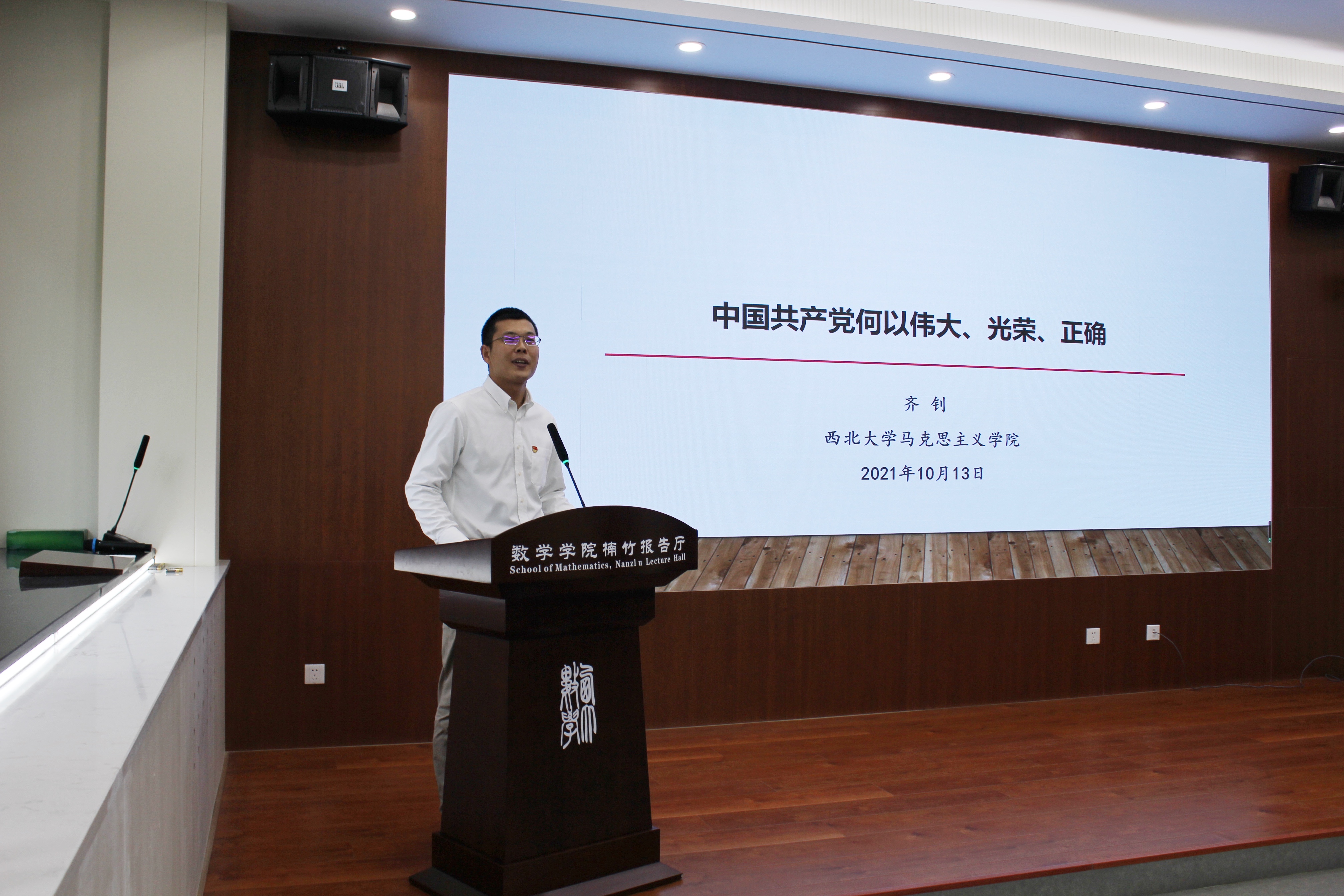 10月13日下午,新葡萄官网邀请校党史学习教育宣讲团成员、马克思主义学院副教授齐钊作了“中国共产党何以伟大、光荣、正确”专题报告。学院行政支部全体党员、学生支部书记、全体团干以及100余名学生代表参加了报告会。报告会由学院学生工作负责人主持。