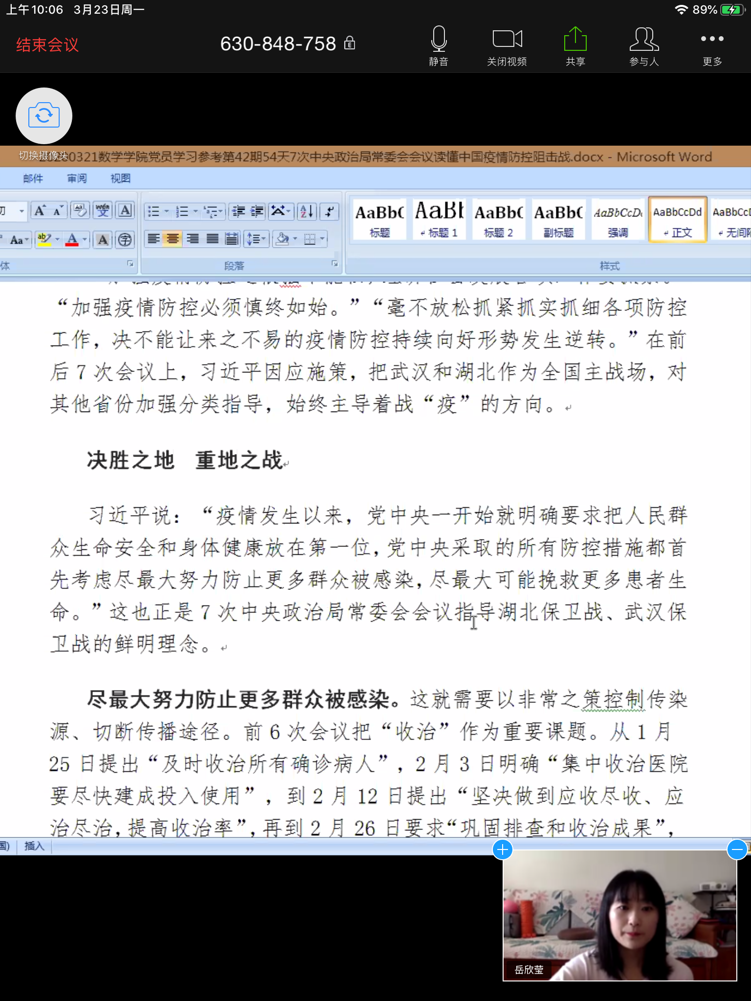 3月23日上午,8455新葡萄官网版行政党支部和学生党支部通过在线视频会议平台召开理论学习暨工作推进会,党委书记李长宏,行政党支部全体党员、学生党支部书记(辅导员)参加了会议。会议由行政党支部书记、行政副院长杨喆主持。