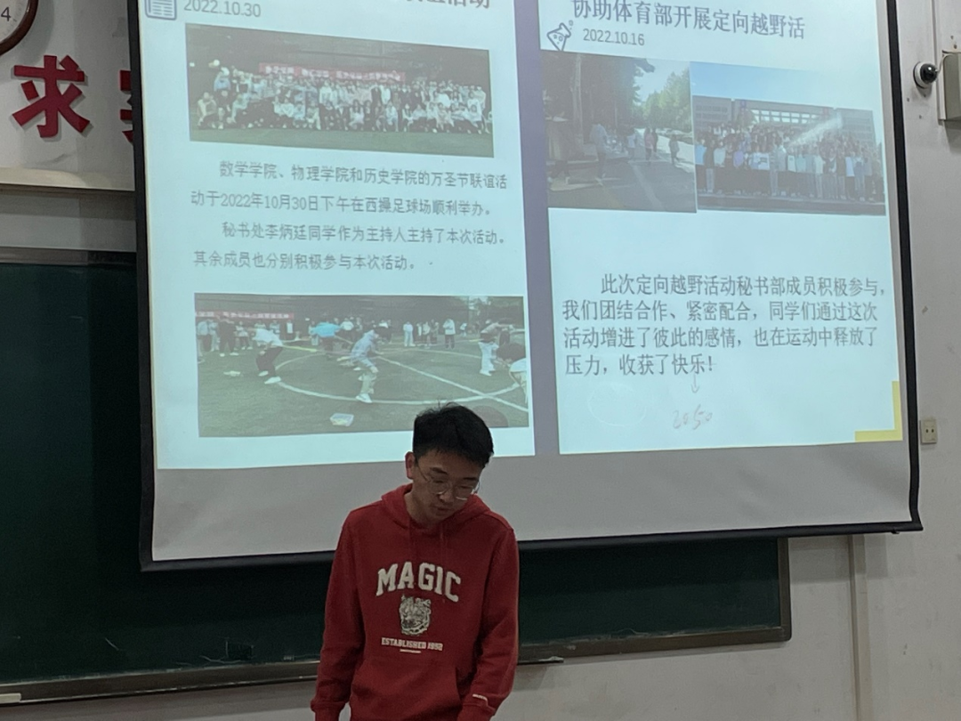 在上一学期的工作中,秘书处成功举办了8455新葡萄官网版主持人大赛、完成每日晚自习查勤、协助体育部举办定向越野活动、 并协助公关部圆满举办三院联谊等工作。新的一学期里,秘书处也将继续增强部门凝聚力、总结完善不足、完成常规工作的同时加强部门交流,努力走向更好的未来!