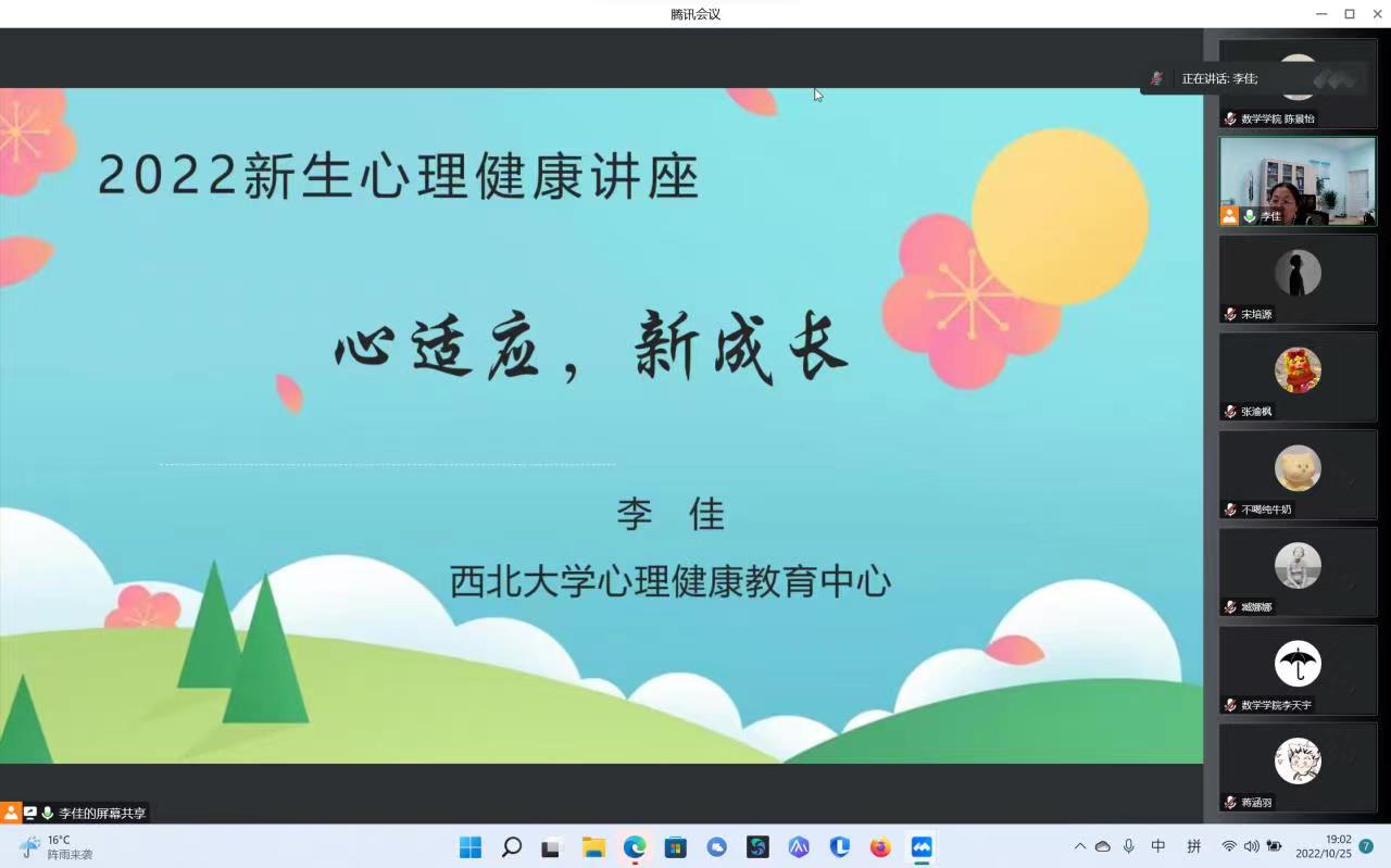 10月25日,新葡萄官网联合艺术学院共同举办“心适应,新成长”线上讲座,心理健康中心李佳老师从健康从‘心’开始、什么是心理问题、大学生常见的心理问题、心理咨询等四个层次,引导同学们学习心理科学知识、正视心理问题、掌握应对策略、提高心理健康水平。