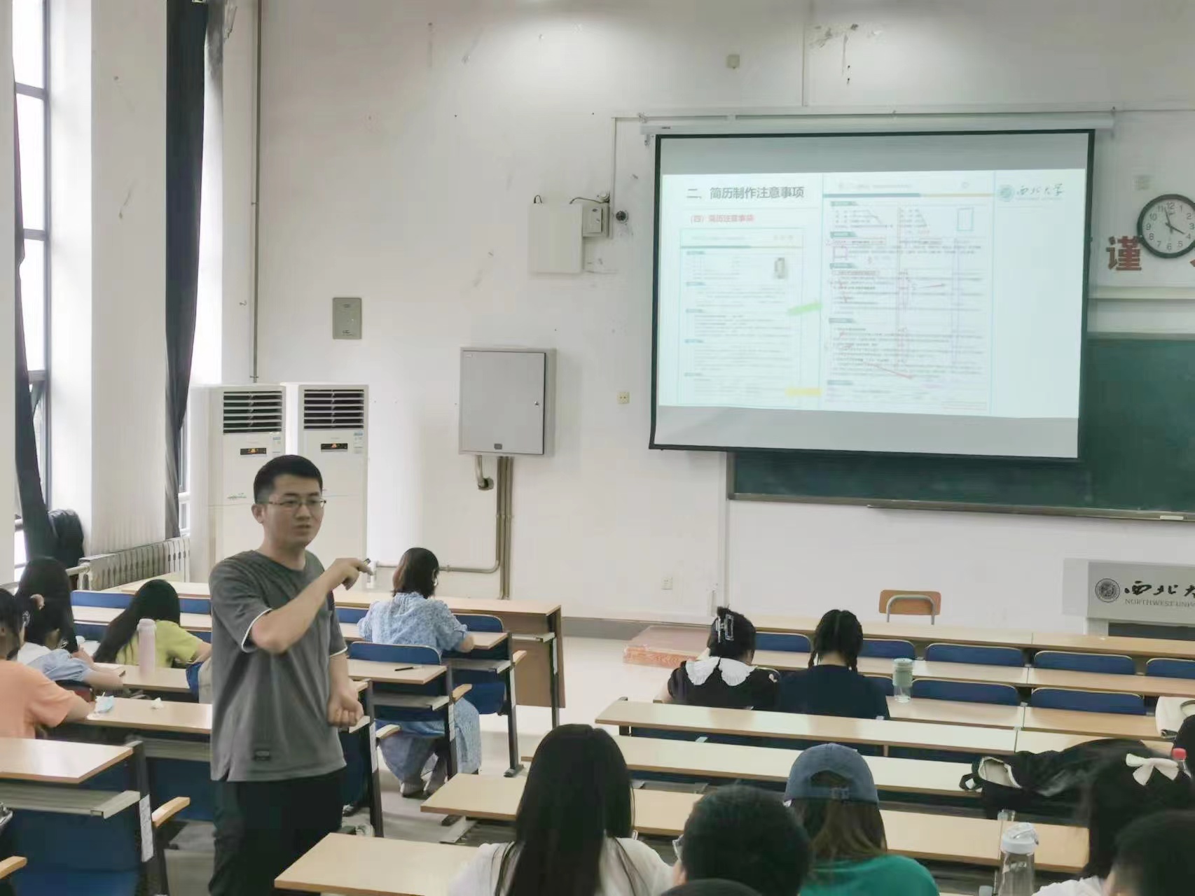 接下来,李刚老师从毕业学生简历概述、简历制作注意事项、大学生规划实践启示、22届本科就业进展四个方面向同学们展开讲述。