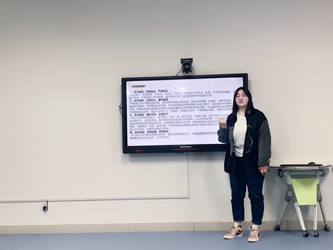 2019级数学与应用数学专业本科生王一涵同学,曾先后参加2020年寒假扶贫社会实践活动及2021年暑期三下乡社会实践活动。她以实践活动所需的宣传投稿方式为侧重点,从文字报道类新闻稿、网络平台以及视频投稿三方面为大家分享了不同投稿方式的细节与注意事项。最后,从学习诚信、经济诚信、生活诚信,就业诚信四方面与大家一同探讨了大学生的诚信教育。