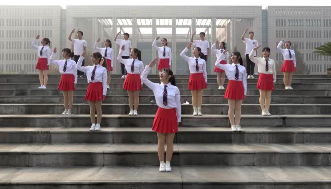 冬日的暖阳洒向大地,照亮了同学们参加初赛时青春洋溢的面容。在初赛的视频中,同学们站在一级级由低至高的台阶上,用有力的动作和灿烂的笑容,展现出青年一代的爱国热情和担当意识。