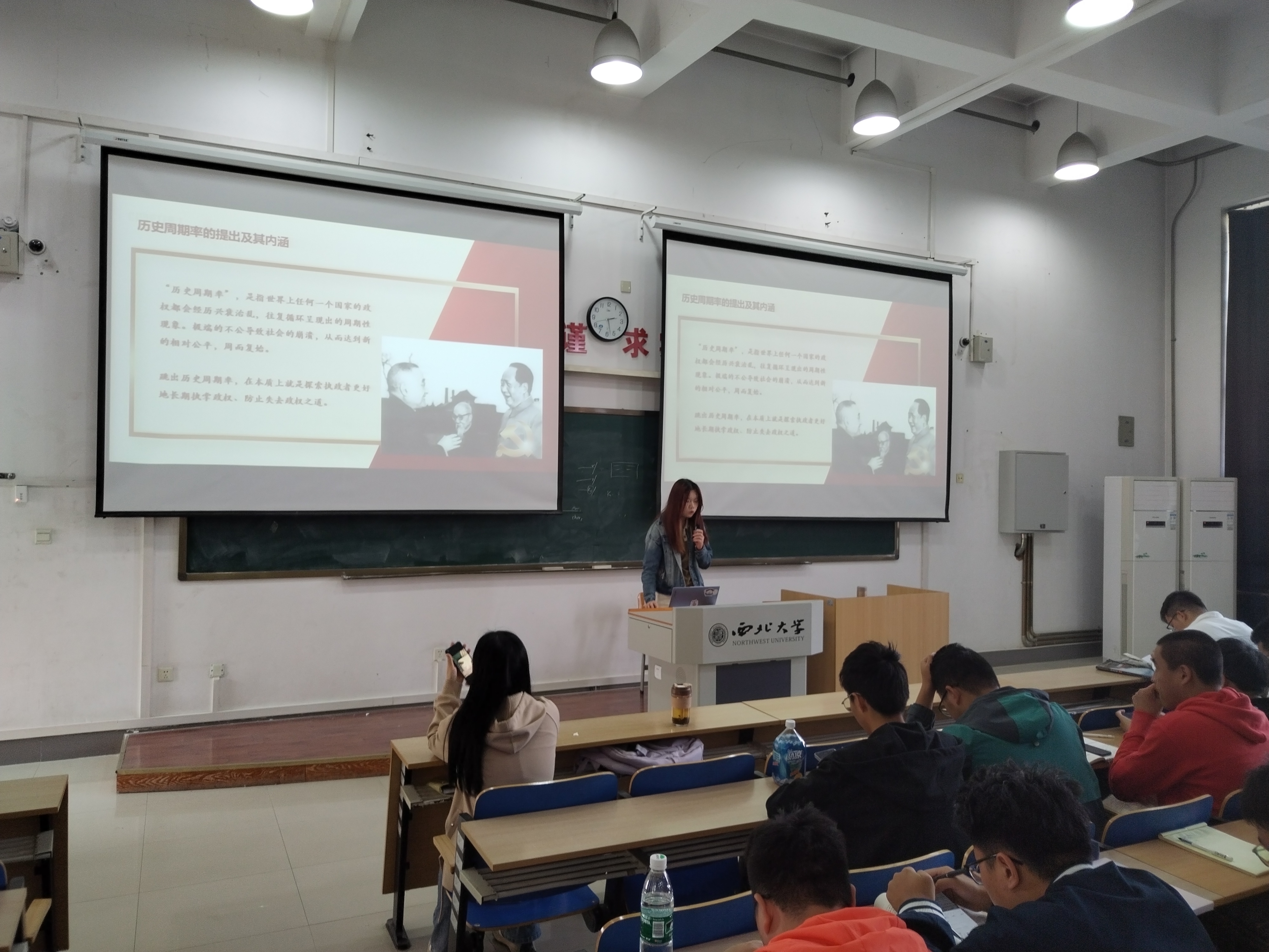 历史周期率是指世界上任何一个国家的政权都会经历兴衰治乱的周期性现象。毛泽东与黄炎培在延安窑洞的对话,黄炎培提出了历史周期率的问题,而毛泽东回答说,只有通过民主和人民的监督,才能跳出历史周期率的支配。张笑同学为同学们讲解了习近平以实际行动回答了如何跳出历史周期率的问题,以全面从严治党的伟大实践赋予自我革命以全新的时代内涵。