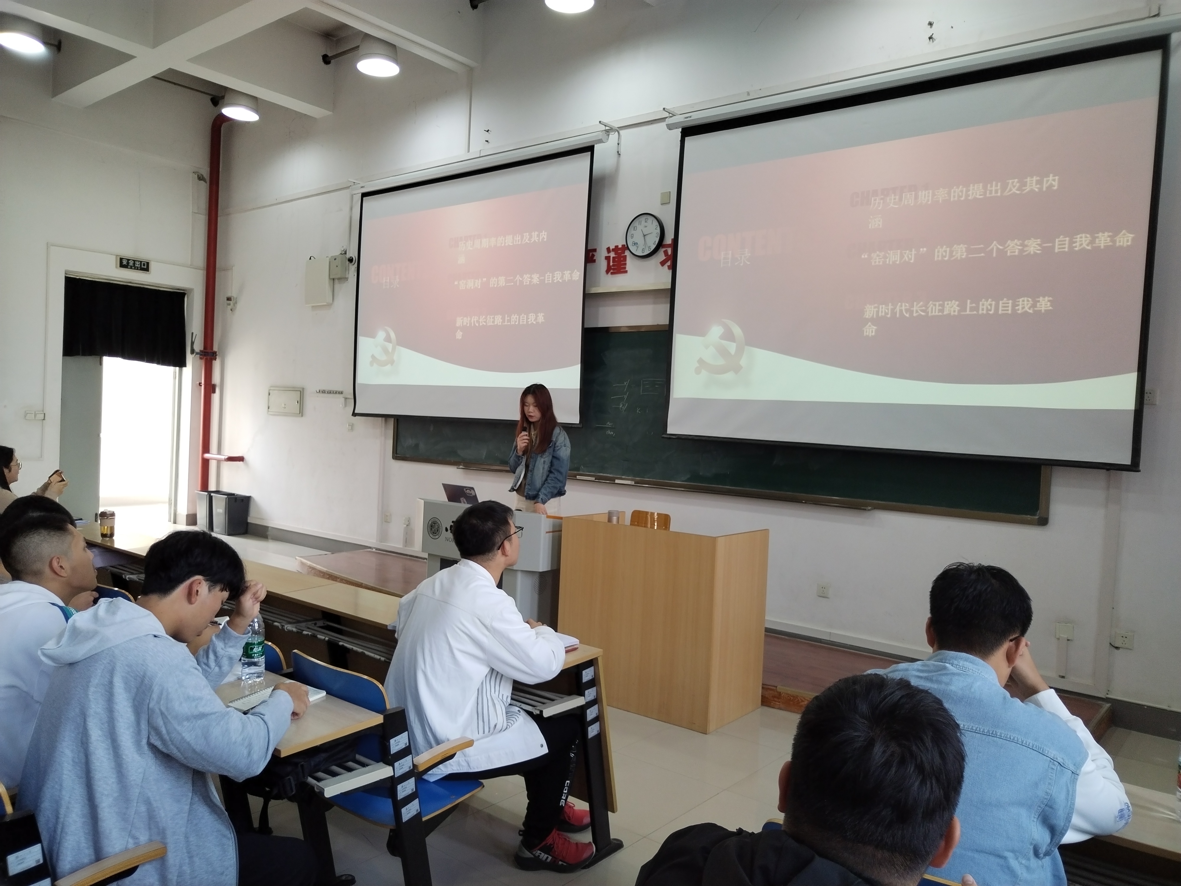 随后由张笑同学分为下述三点为同学们介绍了“新长征路上的自我革命”: