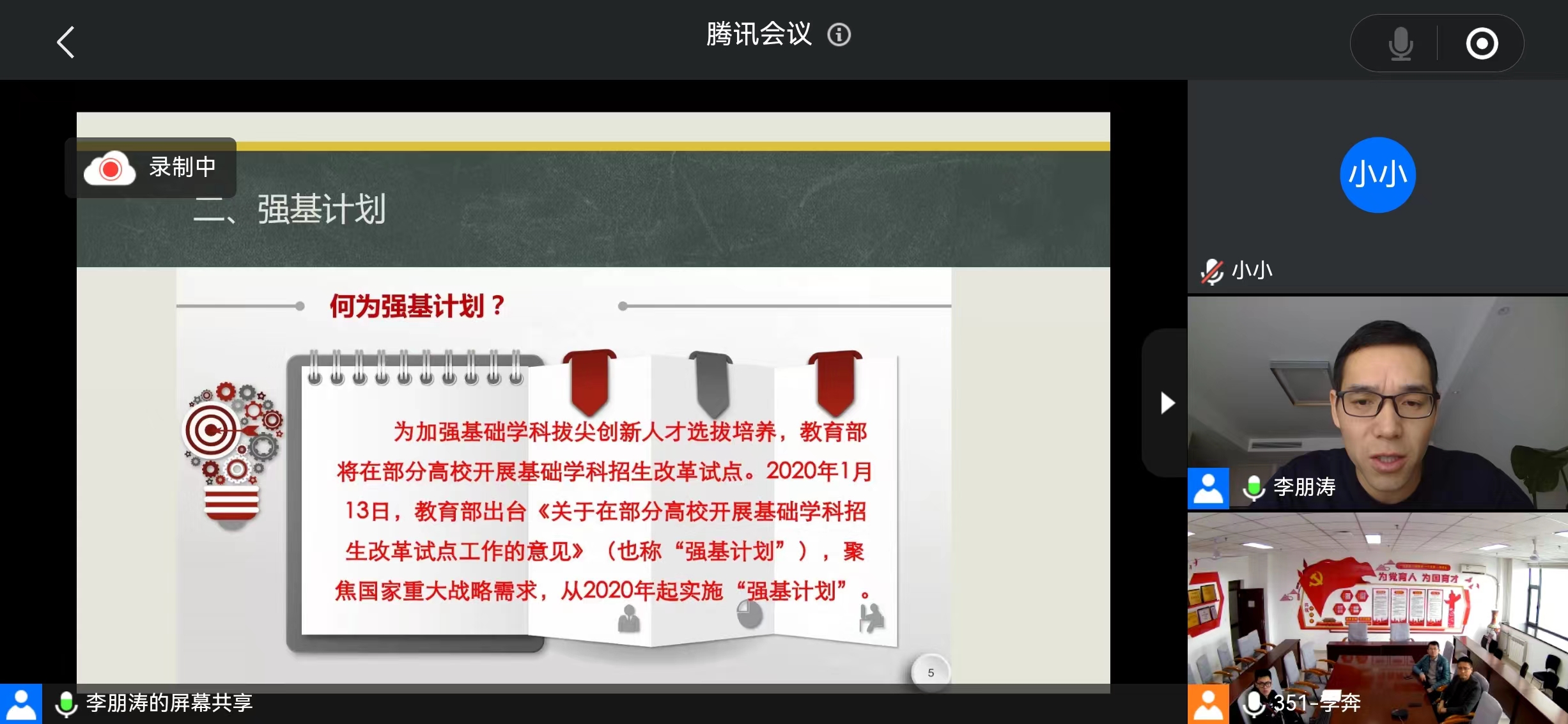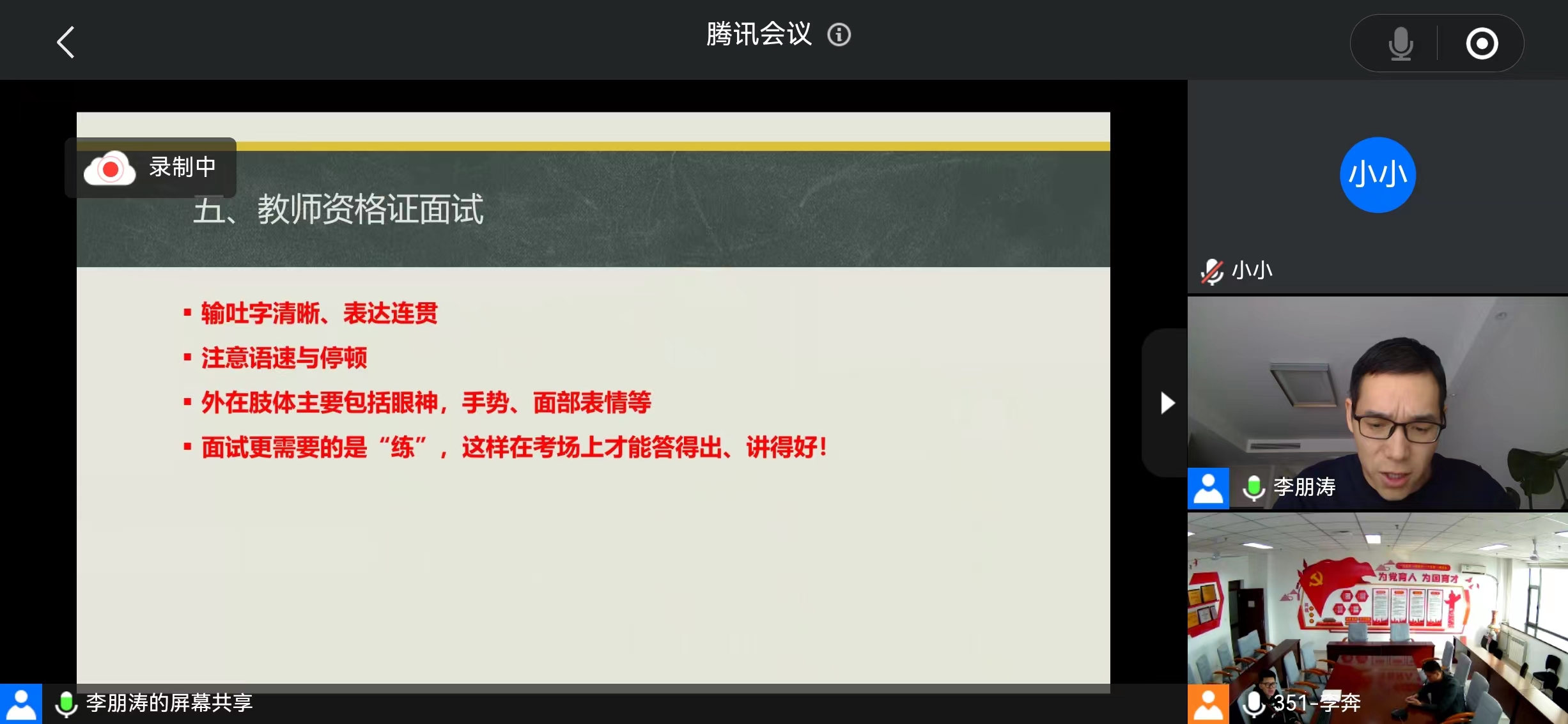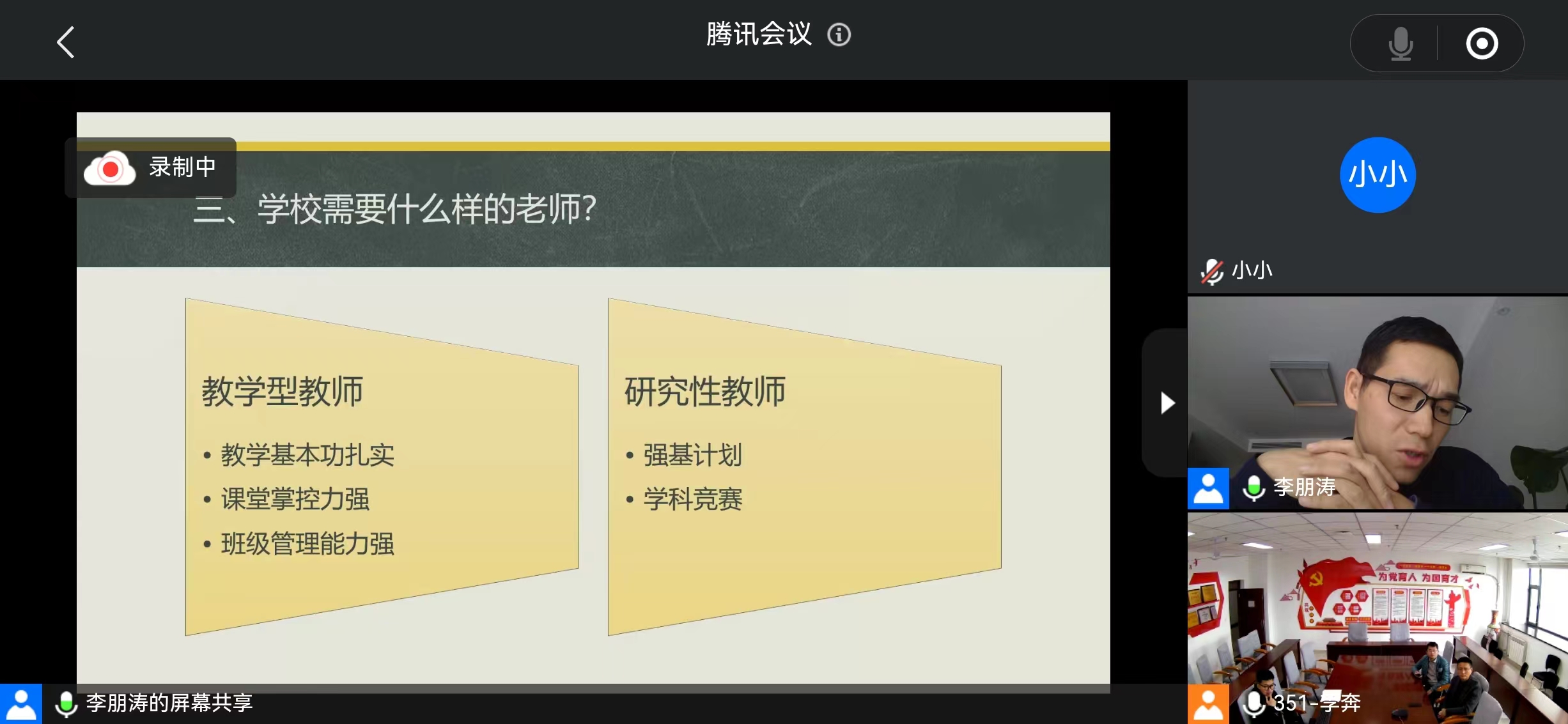 李朋涛老师从名校招生导向、强基计划、中学教师类型、优秀教师必备条件、教师资格证考试面试注意事项等方面进行了深入阐释。他举例分析了高校招生方式的变化与趋势,重点介绍了国家“强基计划”对拔尖创新人才培养、中学教育模式创新、教师从教能力提升的重大作用和实践启发,系统讲解了中学教学型和研究型教师的特点、职业发展路径,交流分享了教育模式的变革、中学教师招聘新趋势、教师职业发展的机遇和挑战等问题。最后,他指出,“基本功”是成为一名优秀教师的必备条件,除了持续强化板书、备课、语言表达,还要在练习做题、练习试讲上下足功夫。