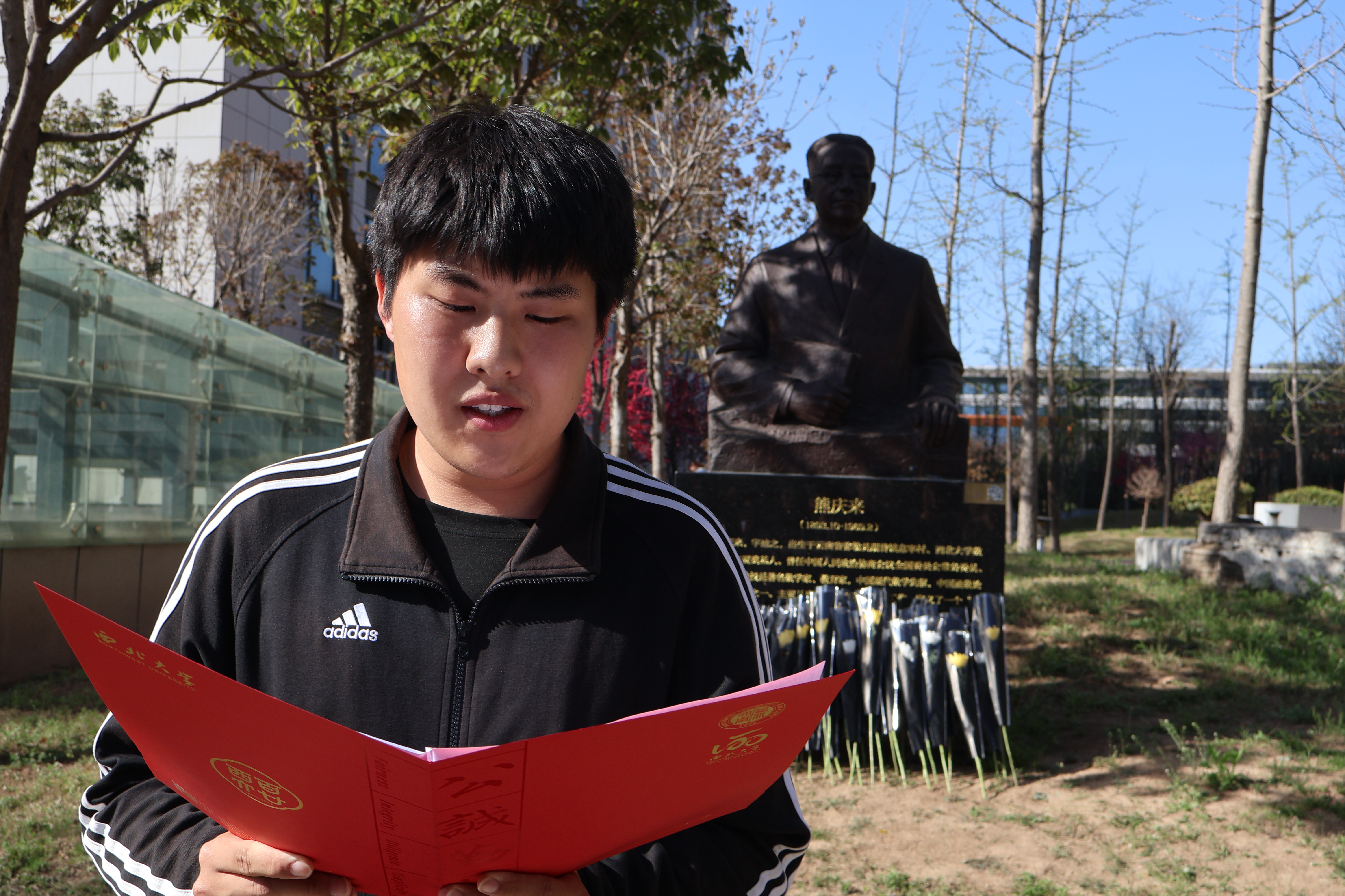 接着全体参与师生移步到王戍堂先生雕像前,共同缅怀王戍堂先生。在场师生为王戍堂先生默哀三分钟,三致深躬后依次向王戍堂先生雕像献花,以表达对先生的深切思念与敬意。