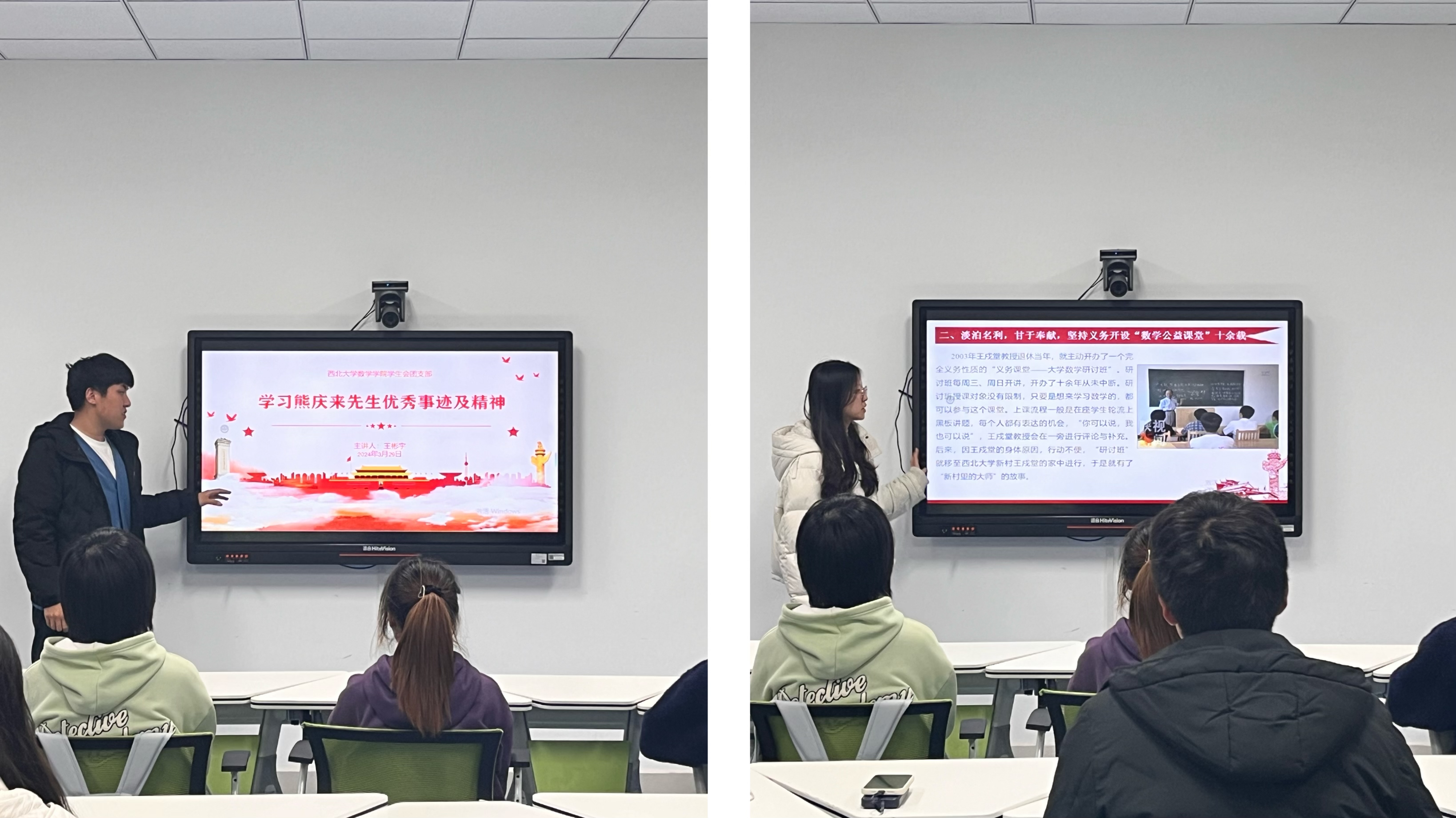 在师生共同缅怀熊庆来先生和王戍堂先生后,8455新葡萄官网版学生会团支部开展了学习领悟两位先生先进事迹与崇高精神的主题团日活动。学生会团支部委员王彬宇同学与陈蕾同学先后为学生会学生骨干及志愿者代表讲述了熊庆来先生与王戍堂先生的教学历程、奋斗事迹与伟大精神,使同学们深刻认识到两位先生伟大无私的教学理念与教育精神以及西大数学学科艰辛又辉煌的百年发展历程。