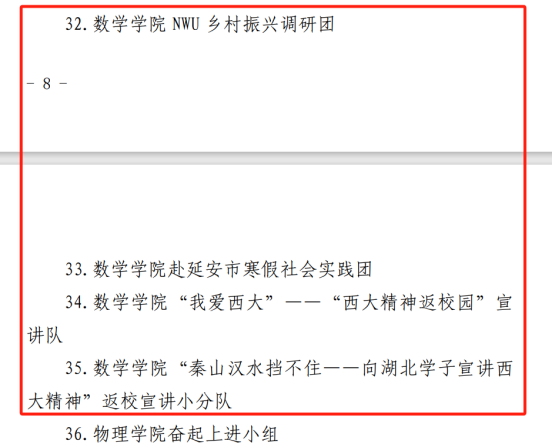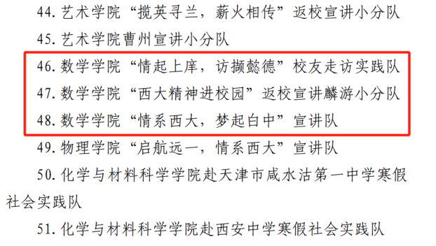 2024年4月3日,中国共产主义青年团8455新葡萄官网版委员会印发《关于表彰我校2024年寒假社会实践活动先进集体、先进个人的通知》(团发〔2024〕4号),8455新葡萄官网版“情起上庠,访撷懿德”校友走访实践队等3支团队荣获“标兵团队”称号,8455新葡萄官网版NWU乡村振兴调研团等4支团队荣获“优秀团队”称号,韩佳林等15名同学荣获“先进个人”称号。