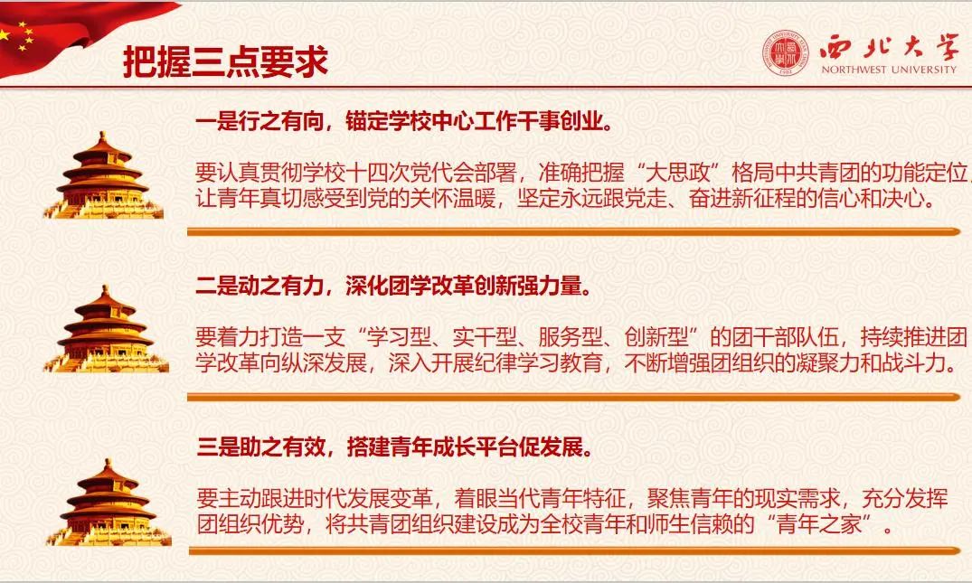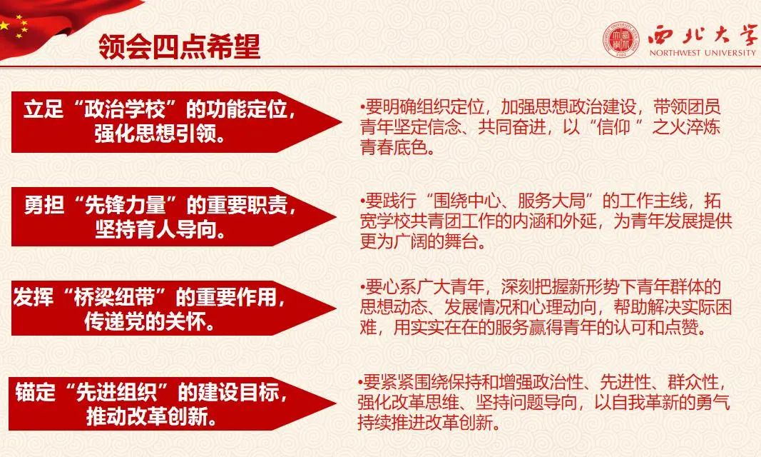 随后他带同学们一起领会团省委徐永胜书记于大会提出的四点希望:立足“政治学校”的功能定位,强化思想引领;勇担“先锋力量”的重要职责,坚持育人导向;发挥“桥梁纽带”的重要作用,传递党的关怀;锚定“先进组织”的建设目标,推动改革创新。在场同学们纷纷表示将会坚定信念、共同奋进,践行“围绕中心、服务大局”的工作主线,用实实在在的服务赢得同学们的认可,团结带领全校广大同学为学校“双一流”建设以及强国复兴贡献青春力量。
