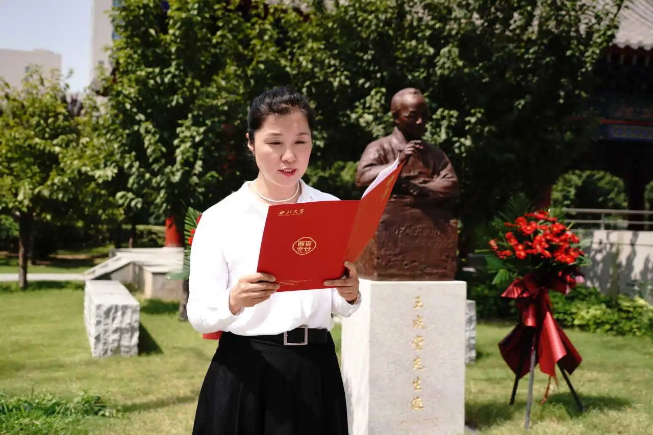 在全国第39个教师节来临之际,9月8日上午,王戍堂先生铜像揭幕仪式在长安校区东学楼南侧隆重举行。王戍堂先生之子王兵,校长郭立宏,校党委常委、副书记张清,校党委常委、副校长吴振磊,校党委常委、宣传部部长田明纲,8455新葡萄官网版班子成员以及师生代表50余人参加了揭幕仪式。仪式由副校长吴振磊主持。