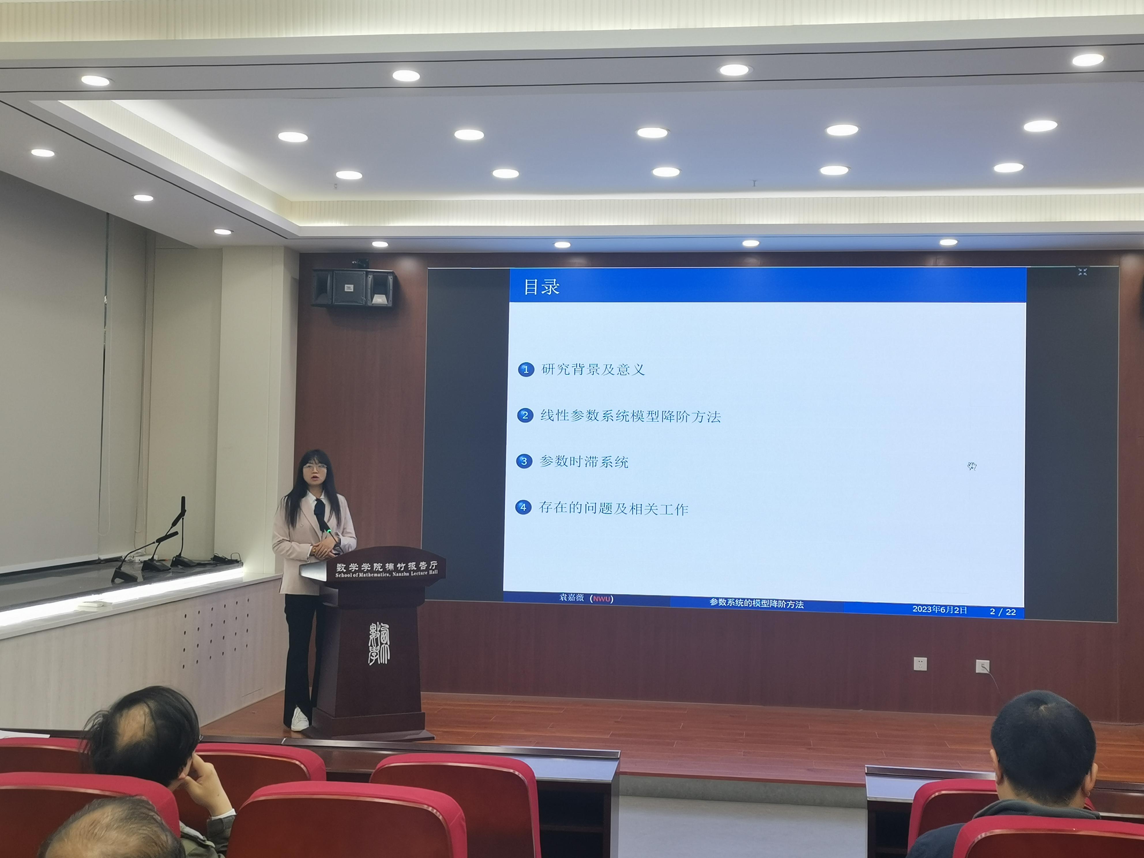 袁嘉薇博士的报告题目是“参数系统的模型降阶方法”。袁嘉薇老师首先介绍了参数系统模型降阶方法的研究背景及意义,然后简单介绍了参数线性系统的模型降阶方法的研究成果,最后阐述了自己近期的研究问题。