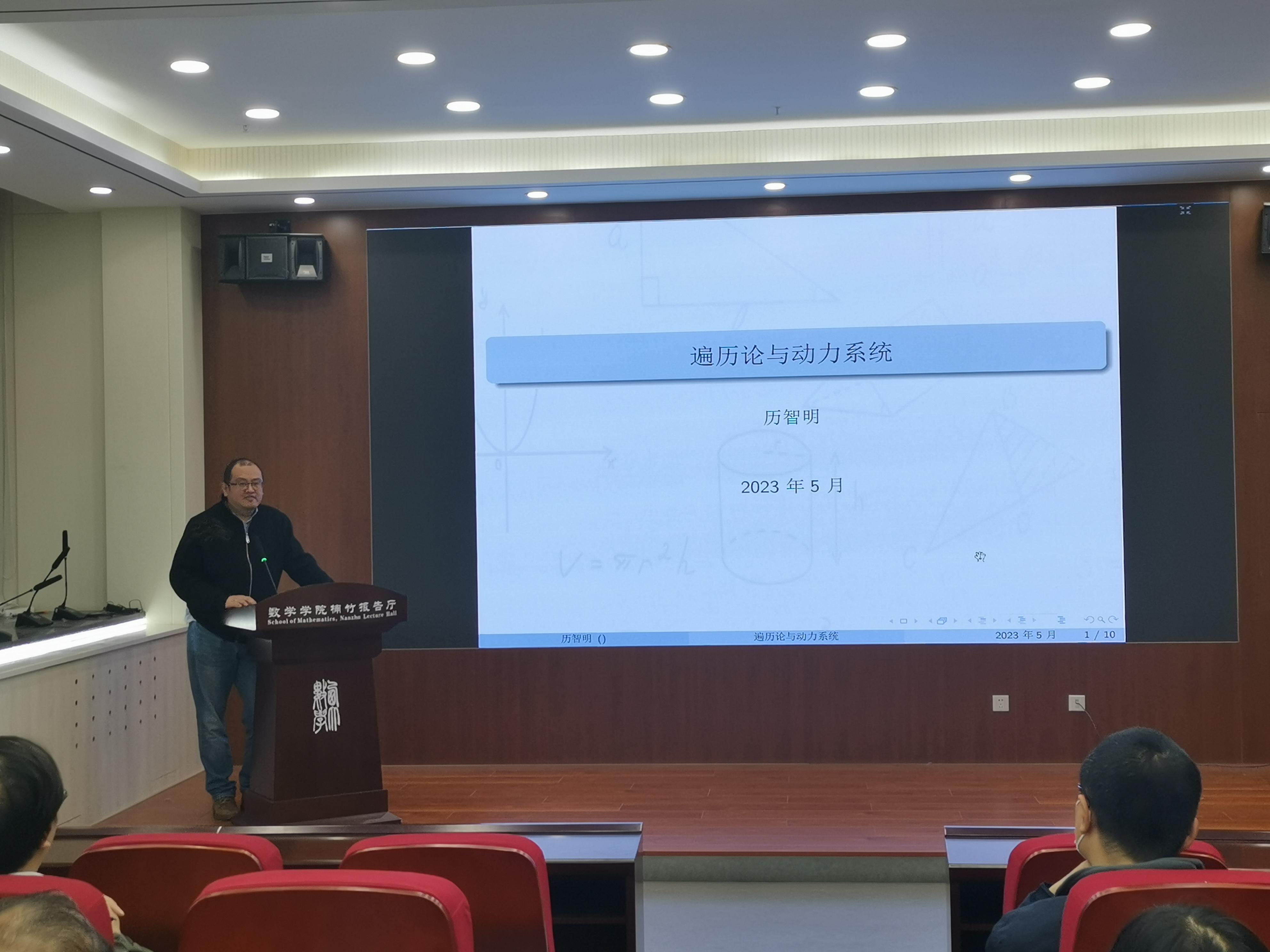 历智明教授以“遍历论与动力系统”为题首先从动力系统的学科起源,学科特点,研究对象和研究目标等介绍了自己的研究方向,最后具体介绍了近期所关注的关于连续系统的通有性质,无穷维光滑系统,高阶群在流形上的光滑作用以及动力系统的熵、维数、重分形分析等几类问题。