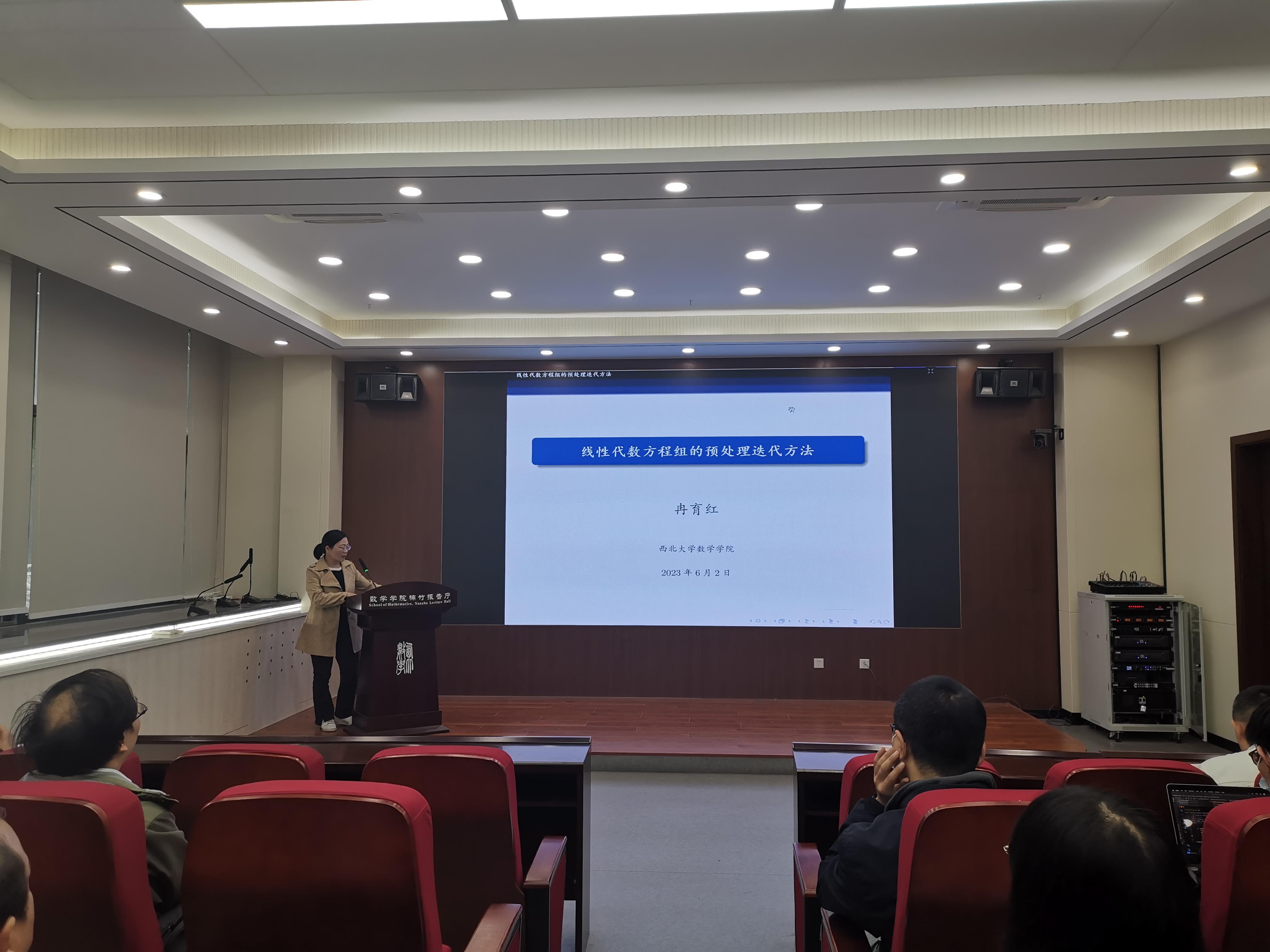 冉育红副教授的报告题目是“线性代数方程组的预处理迭代方法”。首先对自己的研究方向“数值代数”作了简单的介绍,其中包括主要研究问题及相应的求解方法;然后报告了前期的研究工作,重点对几类分数阶微分方程数值离散所得到的线性方程组的求解进行了研究,提出了几类矩阵分裂迭代方法和预处理Krylov子空间迭代方法;最后介绍了近期所研究的问题。