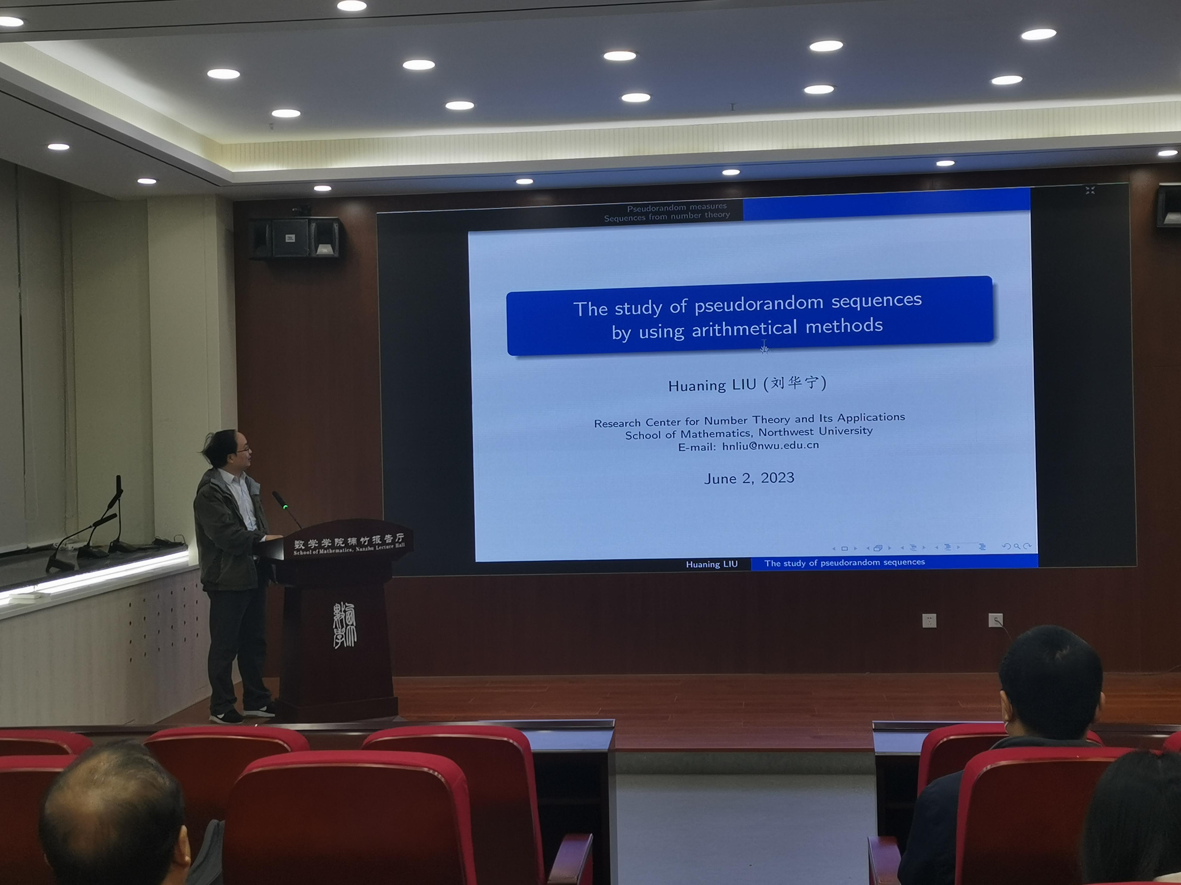 刘华宁教授以“数论方法在伪随机序列研究中的应用”为题,系统介绍了伪随机序列的应用背景和数学理论,并以费马商序列为例展示了数论方法在该领域中的一个具体应用。