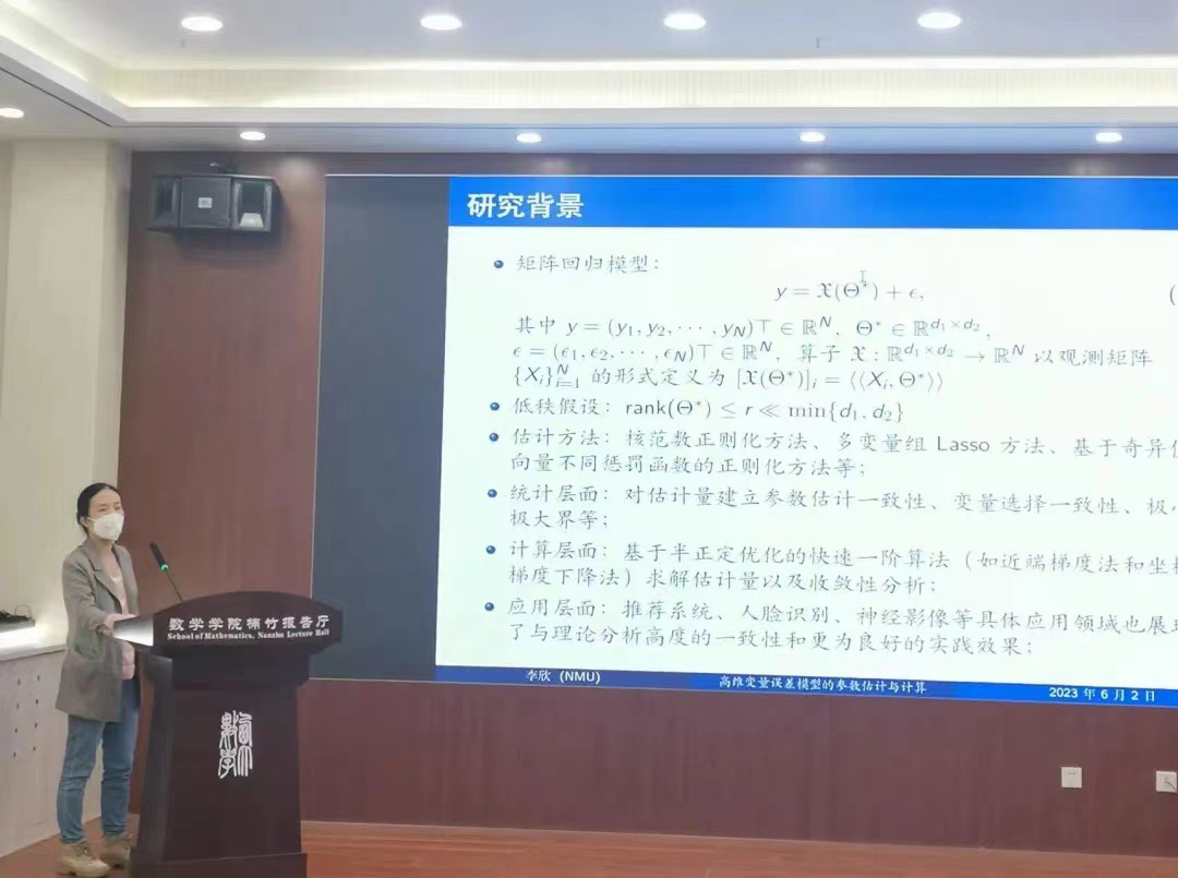 李欣博士的报告题目是“高维变量误差模型的参数估计与计算”。首先介绍了矩阵回归模型的研究背景,包括估计方法,统计理论结果,计算方法和具体应用场景。然后强调了协变量带有测量误差的普遍性与处理测量误差的经典方法。然而这些方法在高维情形下并不适用,这表明了研究高维变量误差模型的必要性与重要意义。最后介绍了自己在估计方法,统计误差界和计算层面的主要研究内容。